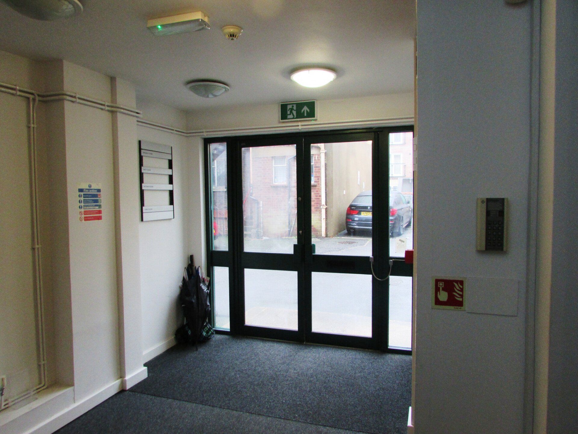 Main door leading to Corridor with intercom and Bathroom on the left with a cubicle with enamel sink, radiator, and double frosted window elevated to the rear.