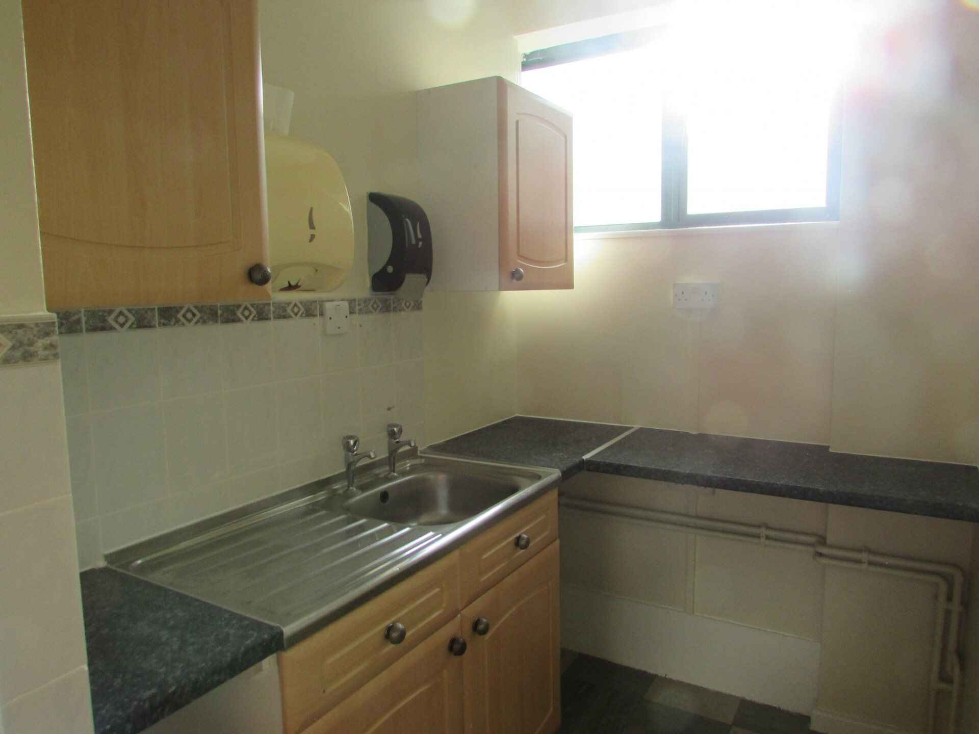 Kitchen to the right with tiled flooring, tiled back splash, stainless steel sink, fitted units and cupboard below sink area and large window elevation to the rear .